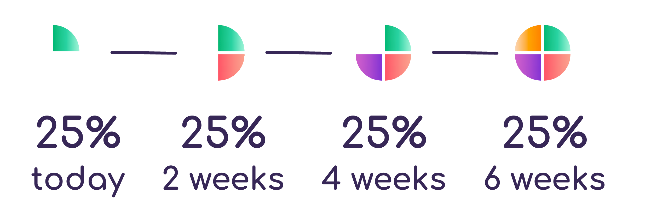 - As little as 25% is due at the time of the purchase, with the remaining amount spread out over equal installments (typically three), each two weeks apart.