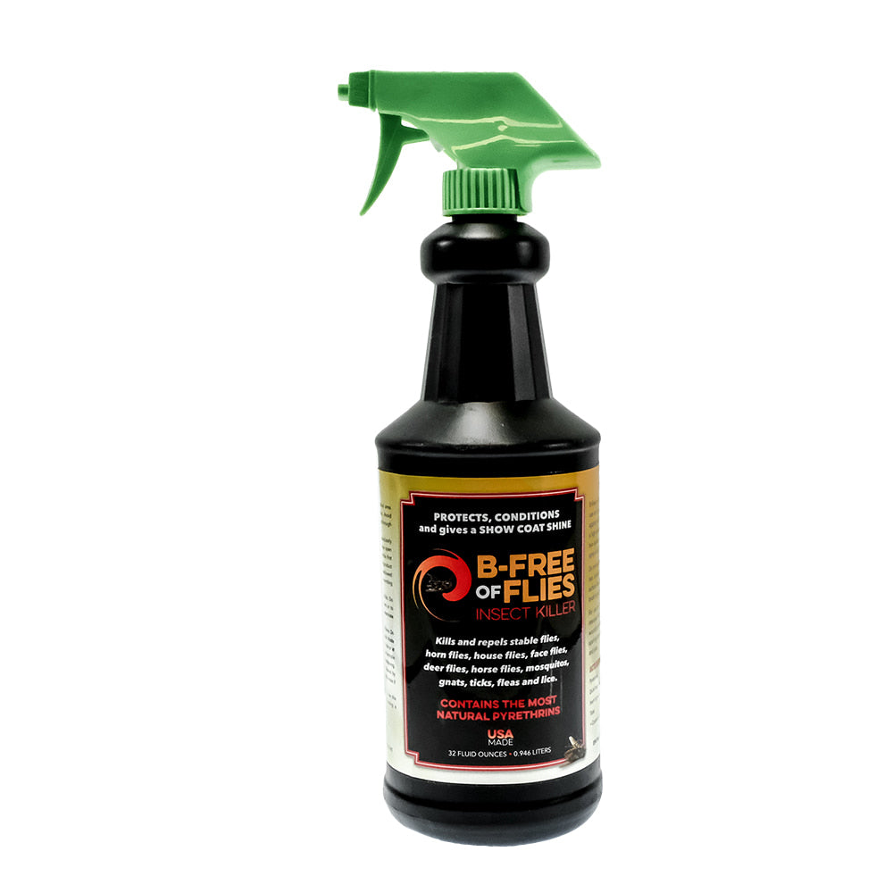 This fly spray is made by B-Free of Flies and has natural Pyrethrin. It helps repel flies, face flies, fleas, and other insects. It is also made to condition the hair coat. Made in the USA.