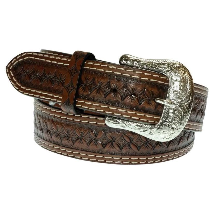 This rich brown hand-tooled men's belt has a circle and cross pattern (Windmill tooled) with white stitching for the full length with a standard silver-toned buckle. Silver toned buckle. 1.5" wide. Get yours today at South Texas Tack!
