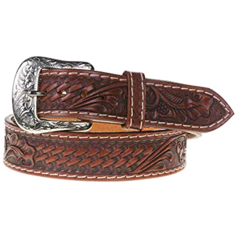 This western belt features a chestnut floral and basket weave stamped finish with white stitching on the top and bottom of the belt and a silver buckle.