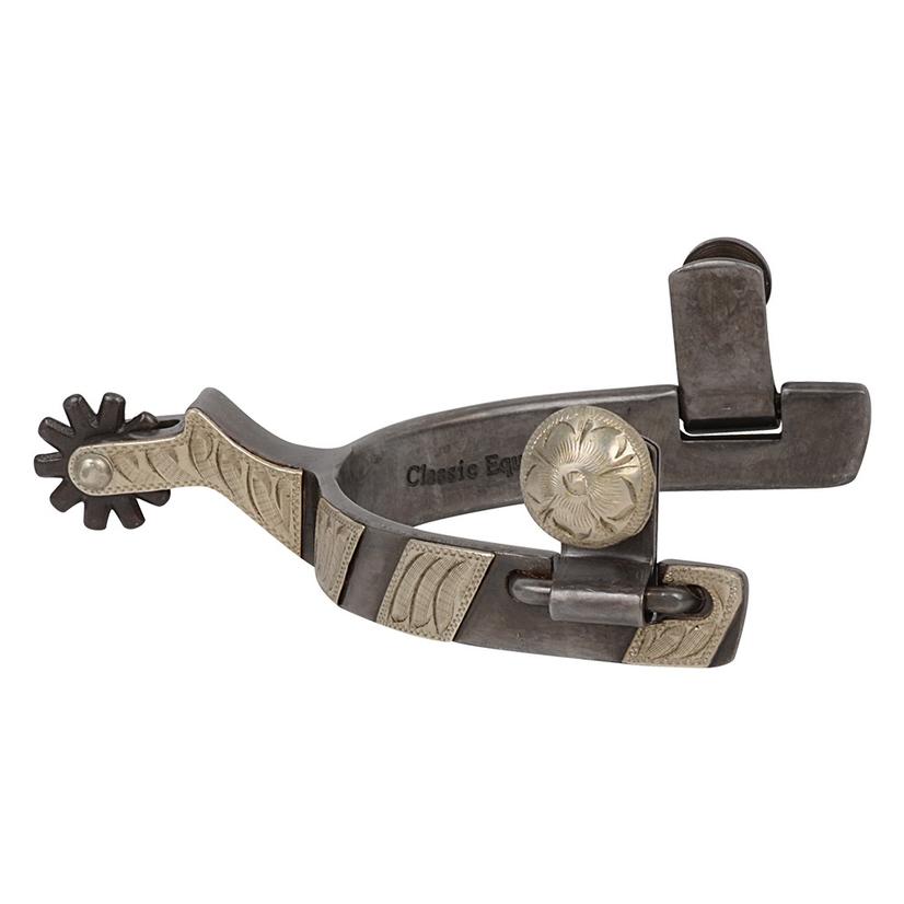 Cowboy series spurs with classic trim. This spur has a ¾ of an inch band that is weighted. This helps keep your spurs down on your boot heel. The shank is 1 1/2 inches. Spurs made by Classic Equine.