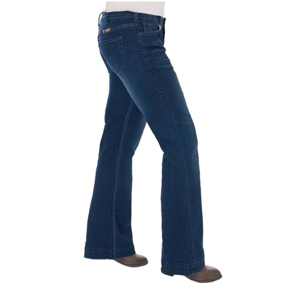 These jeans by Cowgirl Tuff have a nice dark wash denim with a natural fit waist and slim fit through the thigh and seat. Boot cut.