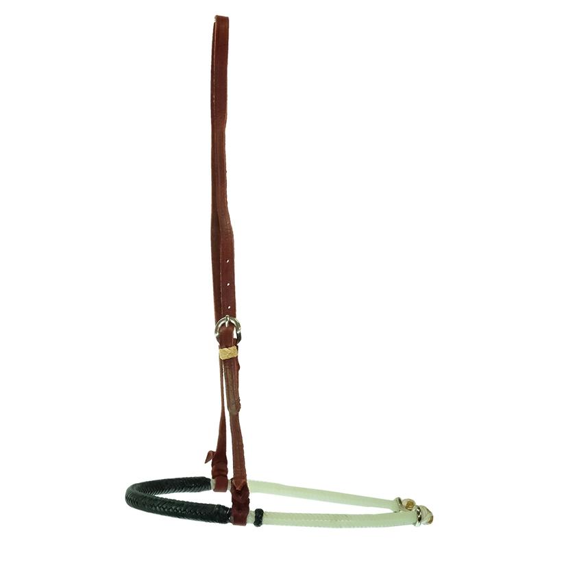 Double rope noseband. This black double rope nose band has stainless steel hardware and single buckle adjustment. The nose band is covered in braided leather and the hanger is latigo leather.