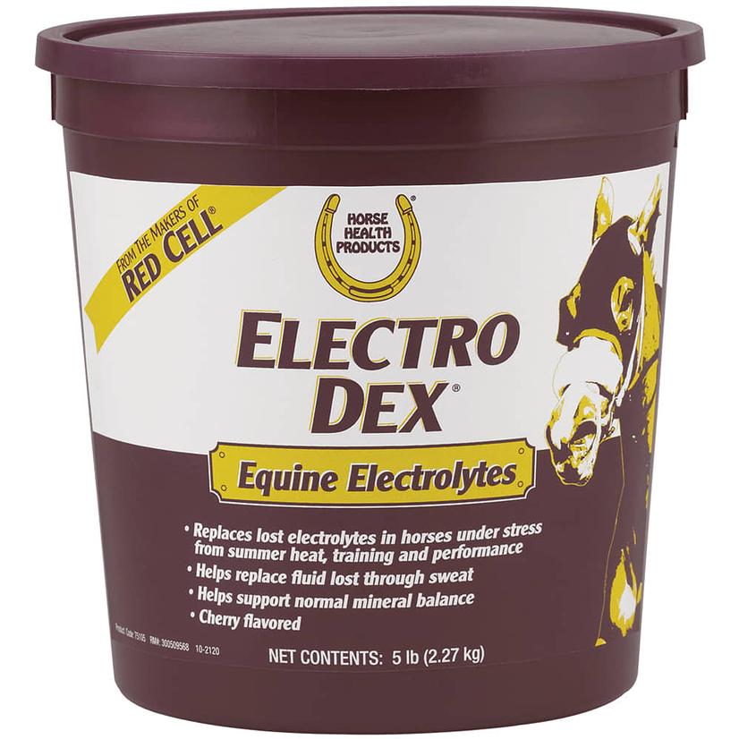 Horse Health Electro Dex Electrolytes delivers sodium, calcium, potassium, and trace minerals to maintain body fluids, which are often depleted during periods of stress. Salt based. Electro Dex may be administered in the horses feed or drinking water at the rate of 2 ounces per 10 gallons of fresh water, or 2 ounces in the horses daily feed ration in place of regular salt. Important: When administered in water, allow no other source of drinking water. The 5lbs pail will last an average horse up to 40 days.