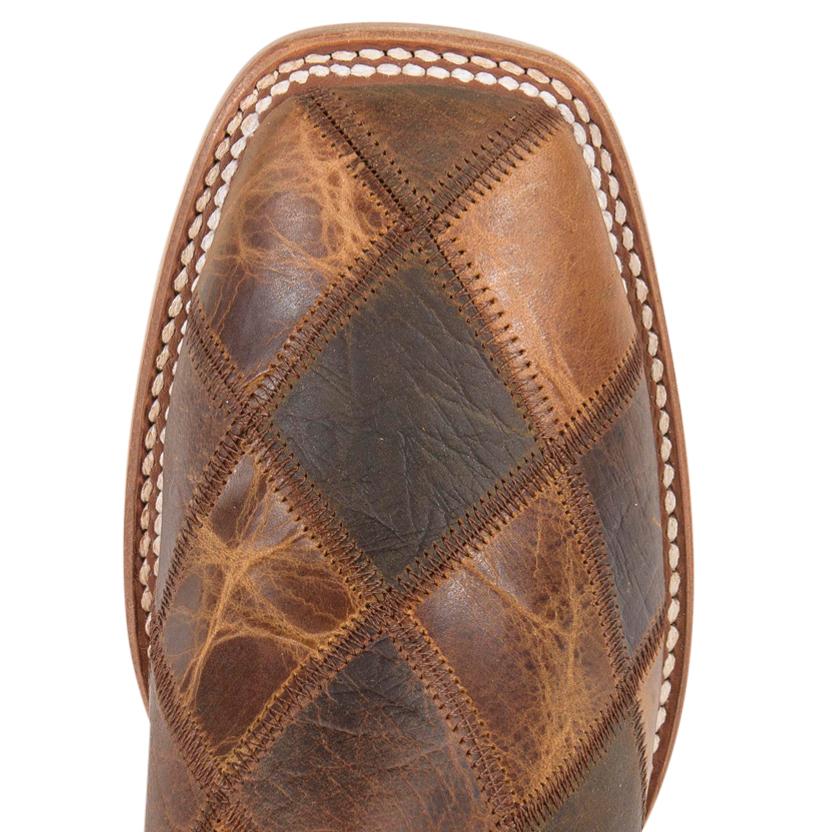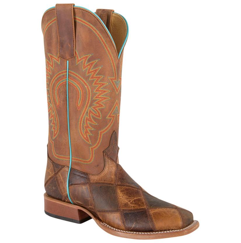 The unique honey and brown patchwork vamp gives these boots a look all their own. The 8 inch shaft is embroidered with the crazy horse pattern in shades of red, gold, and turquoise. The square toe gives this boot a modern and unique style.