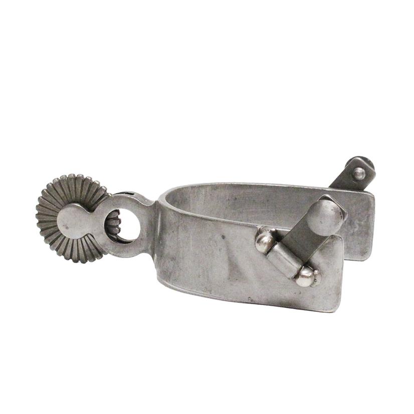 A polished steel level three spur made by Metalab. The band is 1 ¼ inches wide. There is a cut out hole with rope trim on the 1 ¾ inch shank. The band width is 1 ¼ inches. These spurs have a Men’s oval cup and 1 5/8 inch rowel.