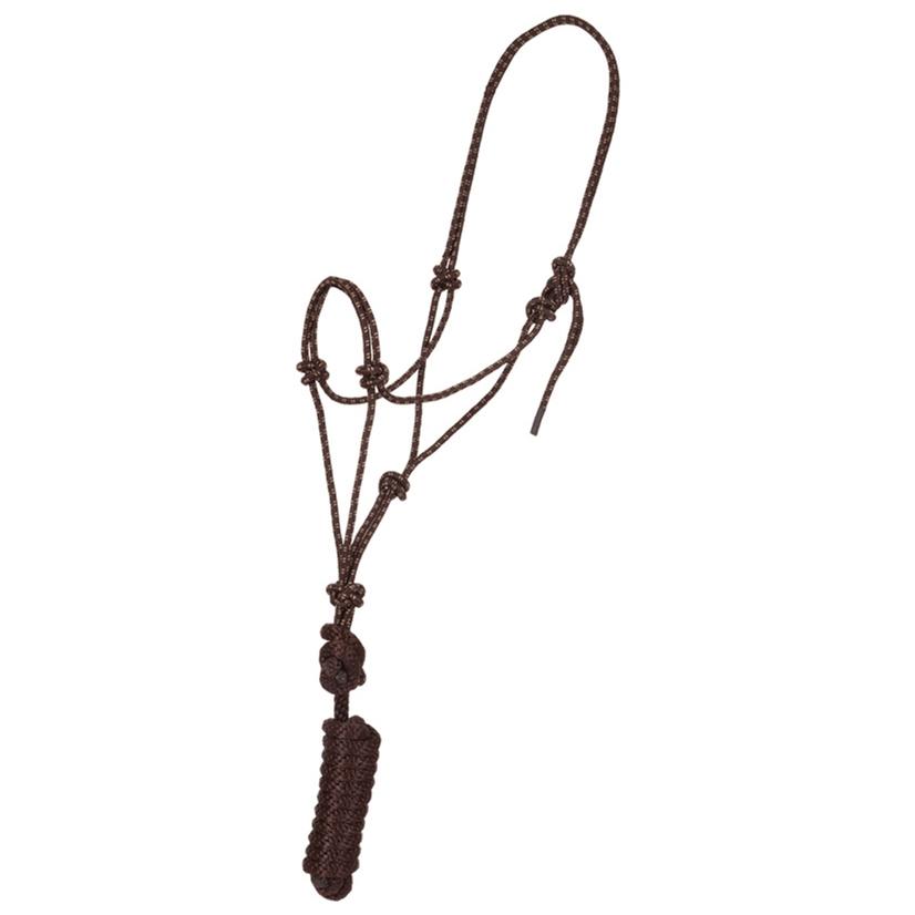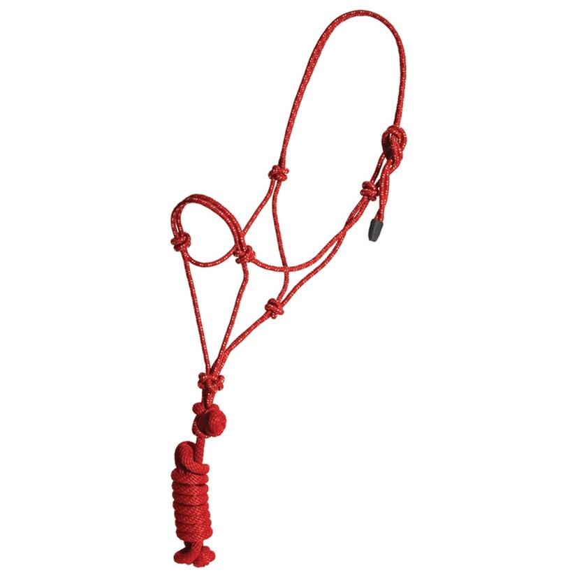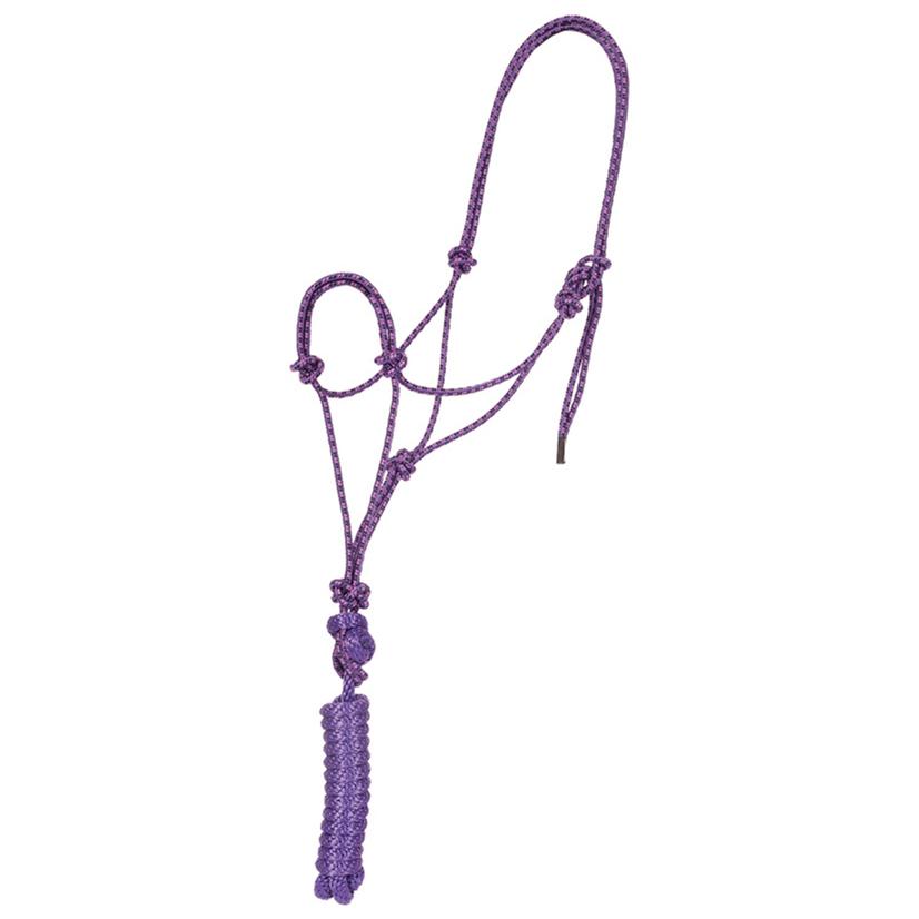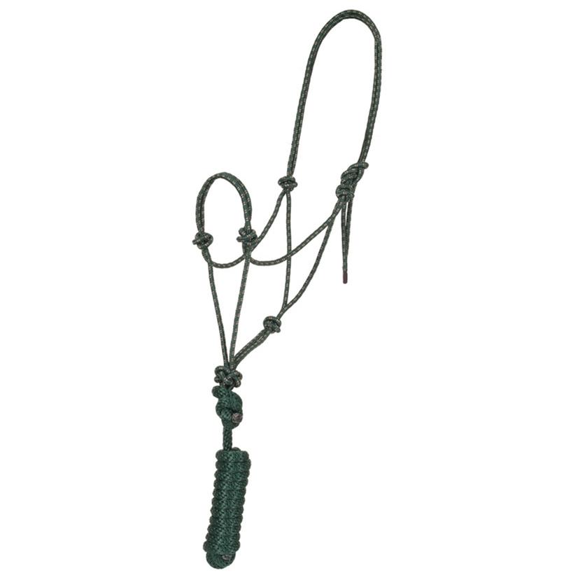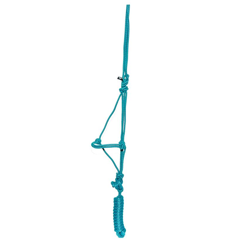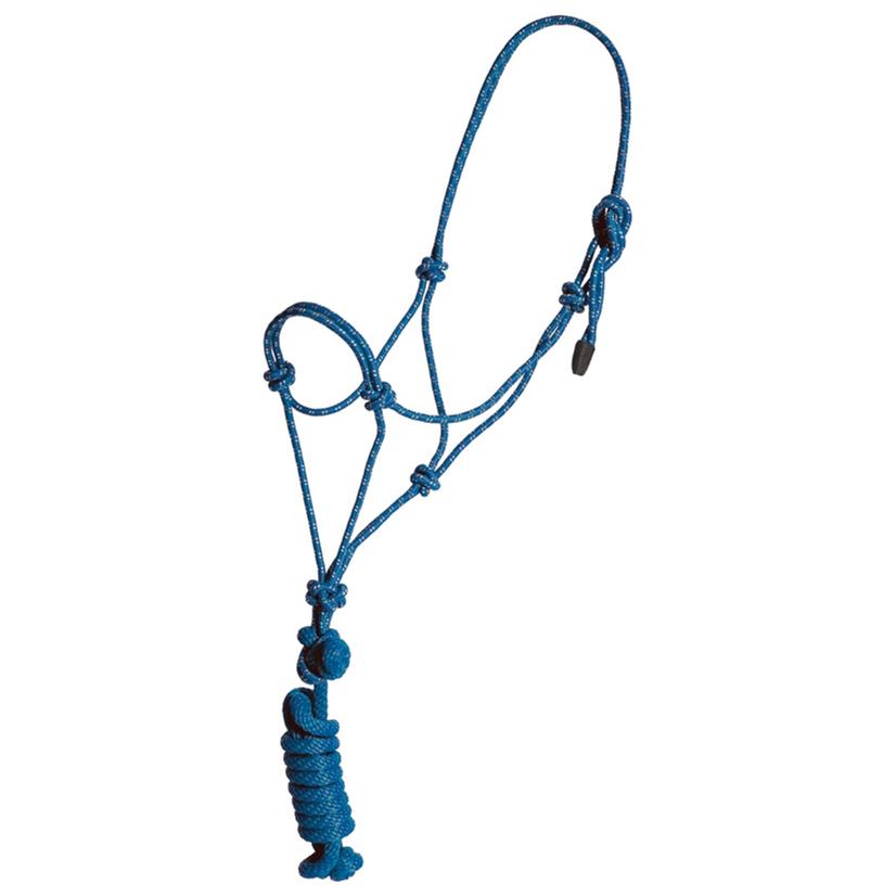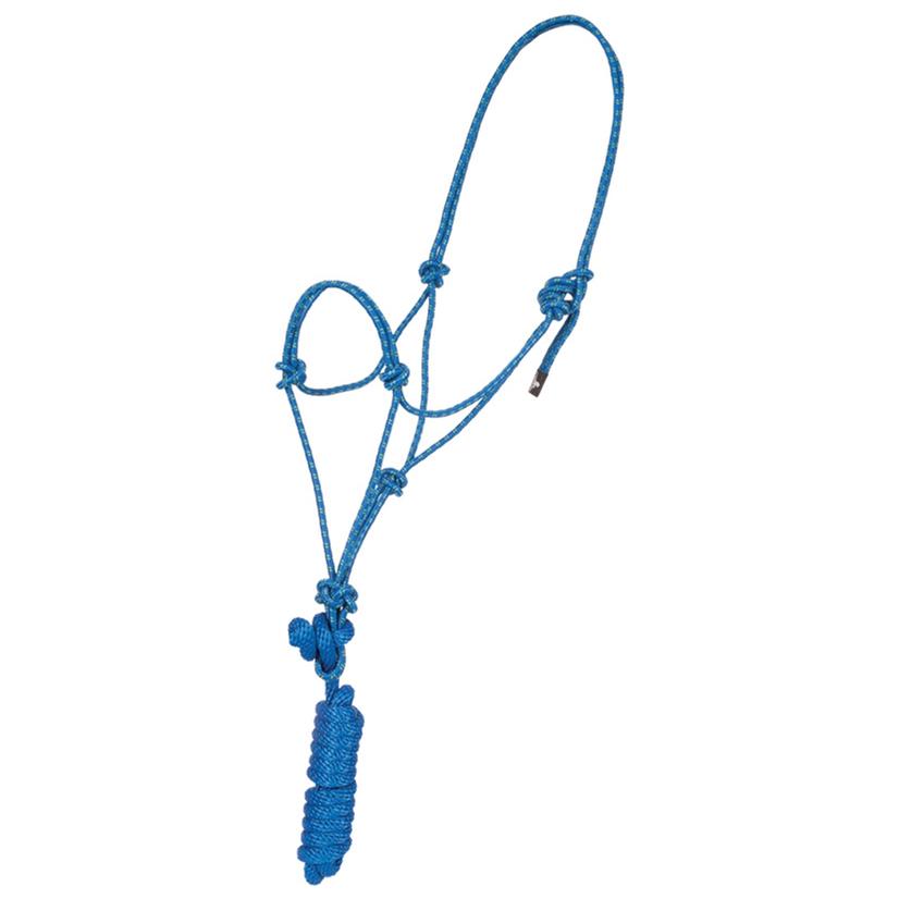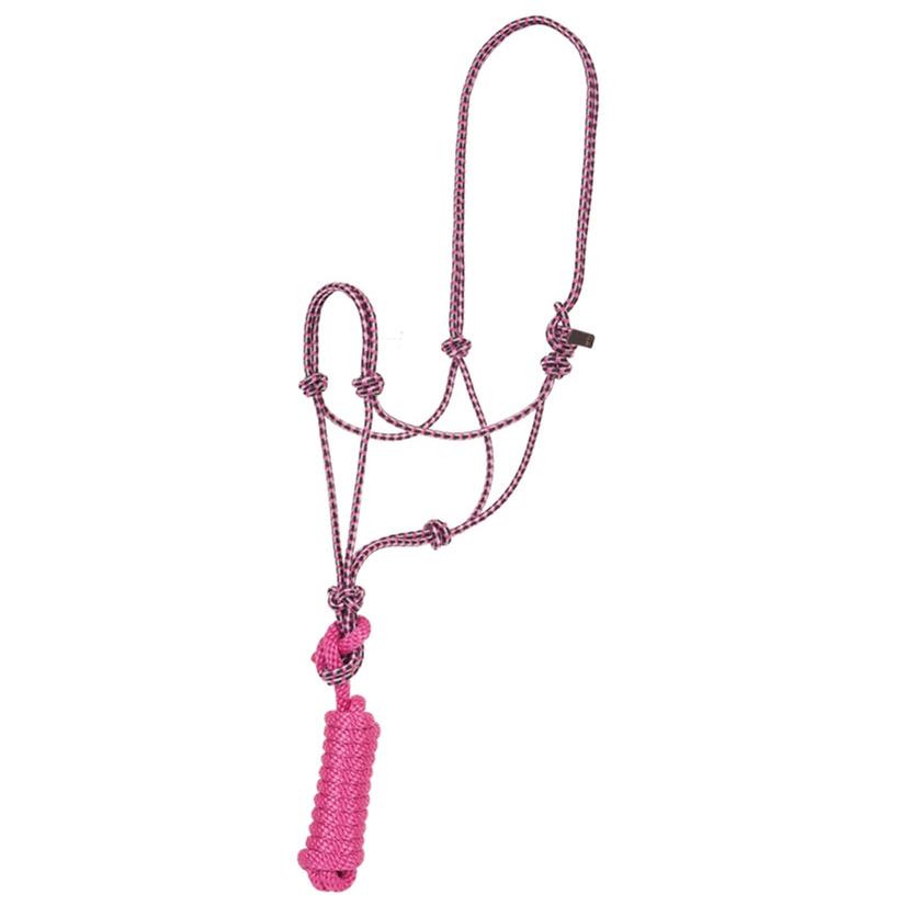 Rope halter made from two tone poly rope that is diamond braided that is one continuous piece and resists rot. The halter is ¼ inch and the lead is 5/8 inch. The lead matches the rope halter and is 8 feet long.