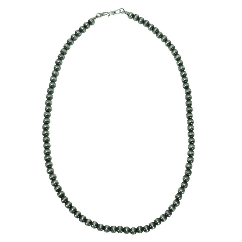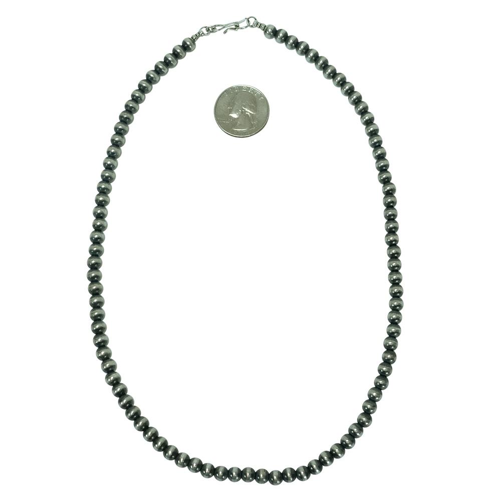 This is going to be our largest size of the Navajo American Pearls; measuring at six millimeters each, it is a bold and beautiful presentation piece. This necklace is twenty-inches in length from end to end and hangs comfortably around the neck. You have the option to add any favorite pendant to make this necklace your very own style.