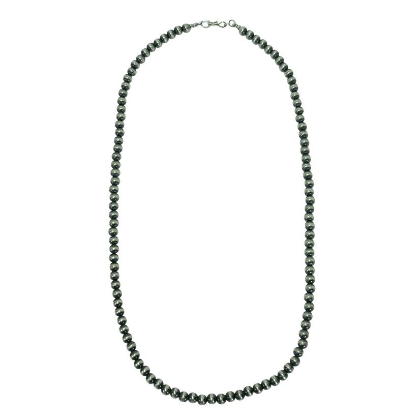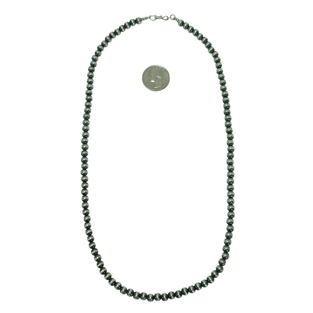 What is classier then an elegant strand of handmade Navajo pearls, nothing. These pearls are made of sterling silver and each one measuring at six millimeters. The perfect length end to end is twenty-four inches, add on your favorite pendant to make this look completely your own.