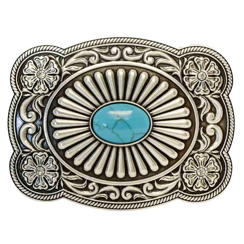 Show off your style with this beautiful antique silver western Nocona belt buckle! The embedded turquoise blue stone surrounded by floral filigrees and 4 rhinestone corners add that special touch to your outfits. Wear your attitude with confidence cowgirls! 2 3/8 in Height / 3 1/8 in Length.