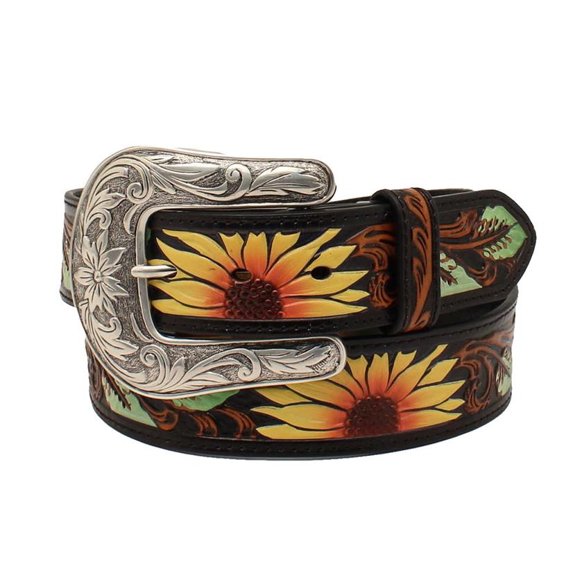 Nocona Tooled Sunflower Women's Belt is made from full grain leather with sunflower and leave tooling. This has a black background so the sunflowers stand out. It comes with a silver buckle.