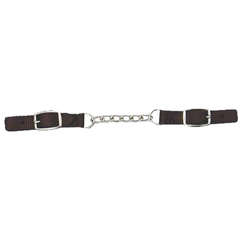 Complete your bridle set with the Professional Choice nylon curb chain. Chocolate nylon straps with single stainless steel buckles on both sides. Single, wide stainless chain.