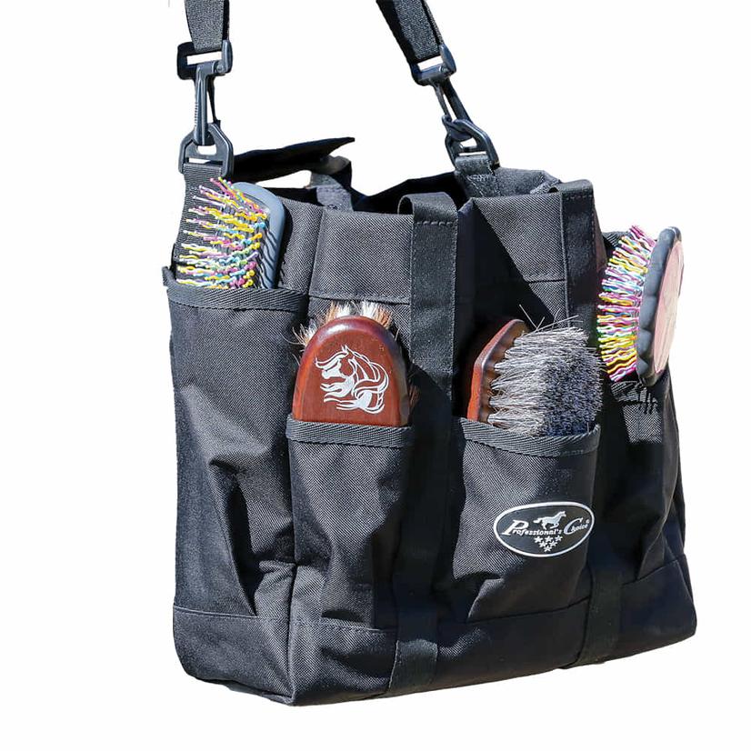 This tack tote by Professional's Choice has multiple pockets for an assortment of functions with elastic bands to hold taller items upright. It features two side pockets with hook and loop closure to hold items secure and upright. There are two large pockets and an open center. The two handles and padded adjustable/removable shoulder strap for convenient carrying.