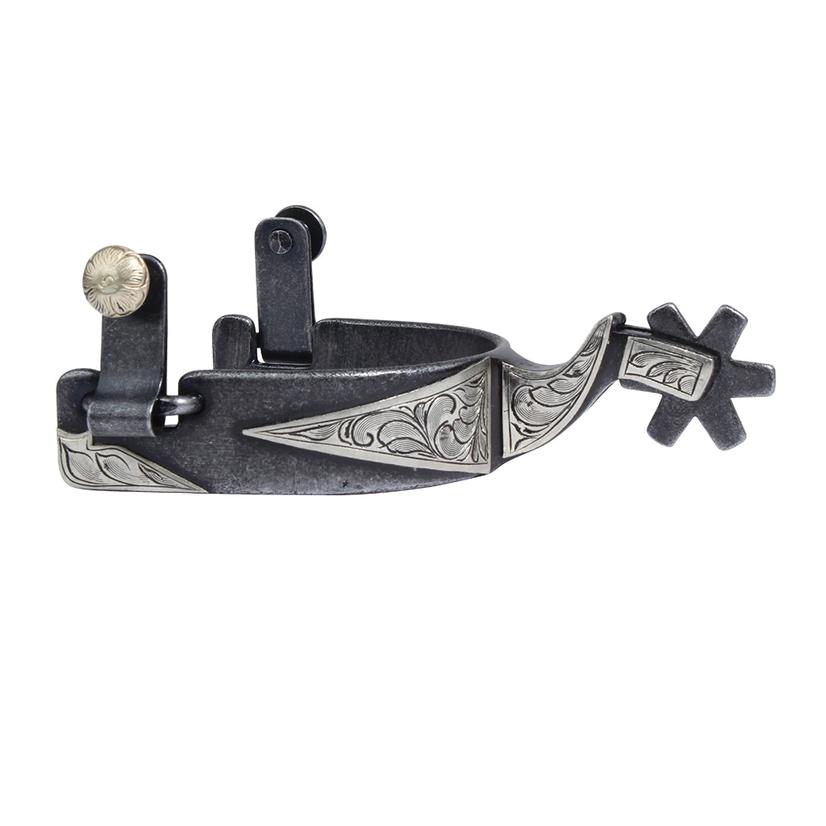 This Professional's Choice Engraved Cowboy Men's spur features a unique gunmetal finish with engraved detailing and a 6-point rowel. Get yours today at South Texas Tack! Sold as a pair!