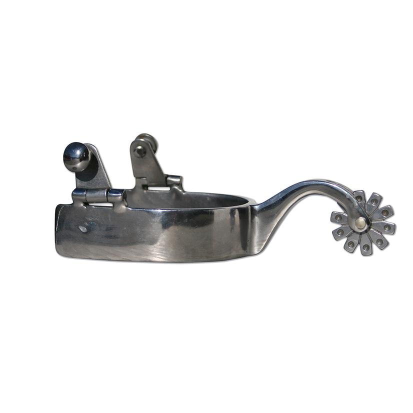 These polished steel training spurs feature a unique curved shank that is 2 1/2" long and a stylish 10 pt. rowel with a decorative design. Shank: 2 1/2" Band: 1