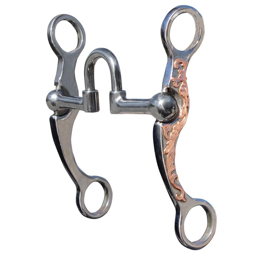 This weighted cheek allows for more control and added poll pressure while maintaining clean lateral movement. The cheek pieces are polished steel with decorative copper designs. Ported chain mouthpiece to provide some tongue relief while the chain is light on the bars. Allows for independent rein action.
