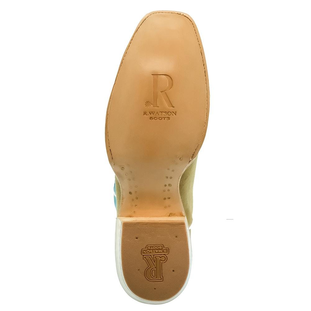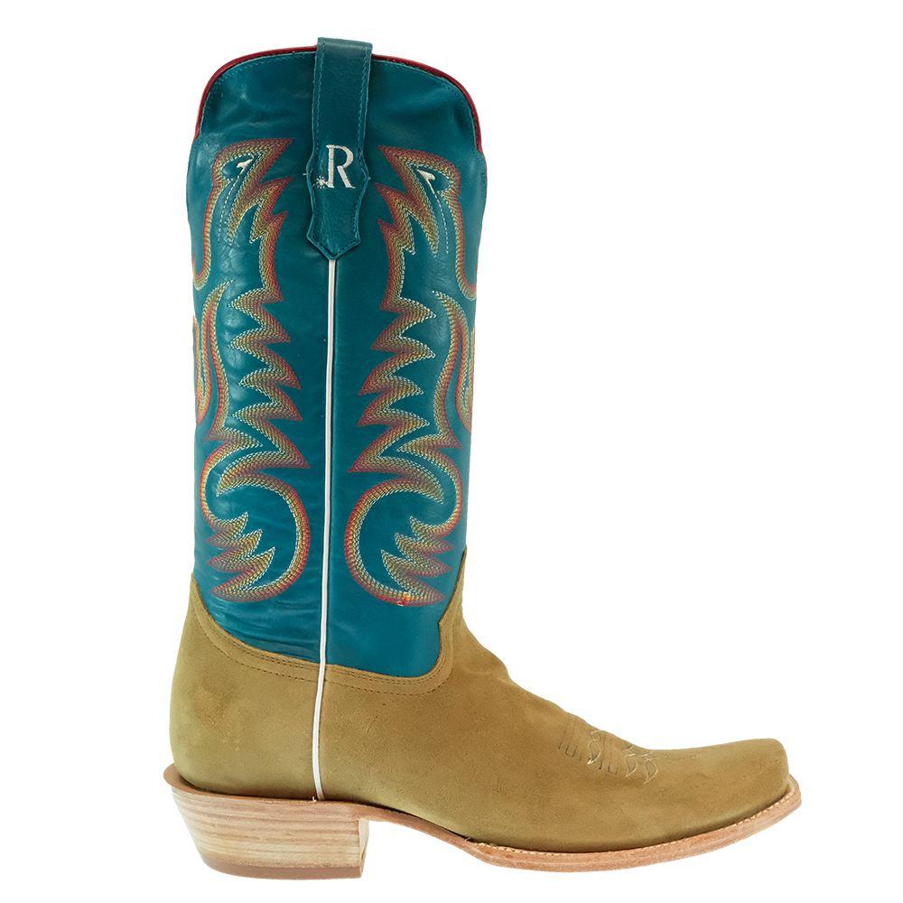 No matter the occasion, this pair by R. Watson boots will have you looking your very best! The boot features a sand roughout leather vamp, 13 inch marine blue cow leather shaft, medium square toe and cowboy heel. A great boot for the dance floor, rodeo, county fair or music festival.
