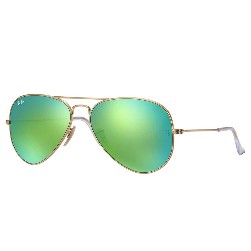 A flashy spin on a timeless classic the Ray-Ban Aviator Classic Green Flash Matte Gold Metal Sunglasses are here to be seen! The Matte Gold metal frames are the perfect understatement to the Green flash mirror lenses. The mirror lenses will help protect against glare and give you more visual comfort and style. These sunglasses will not disappoint!