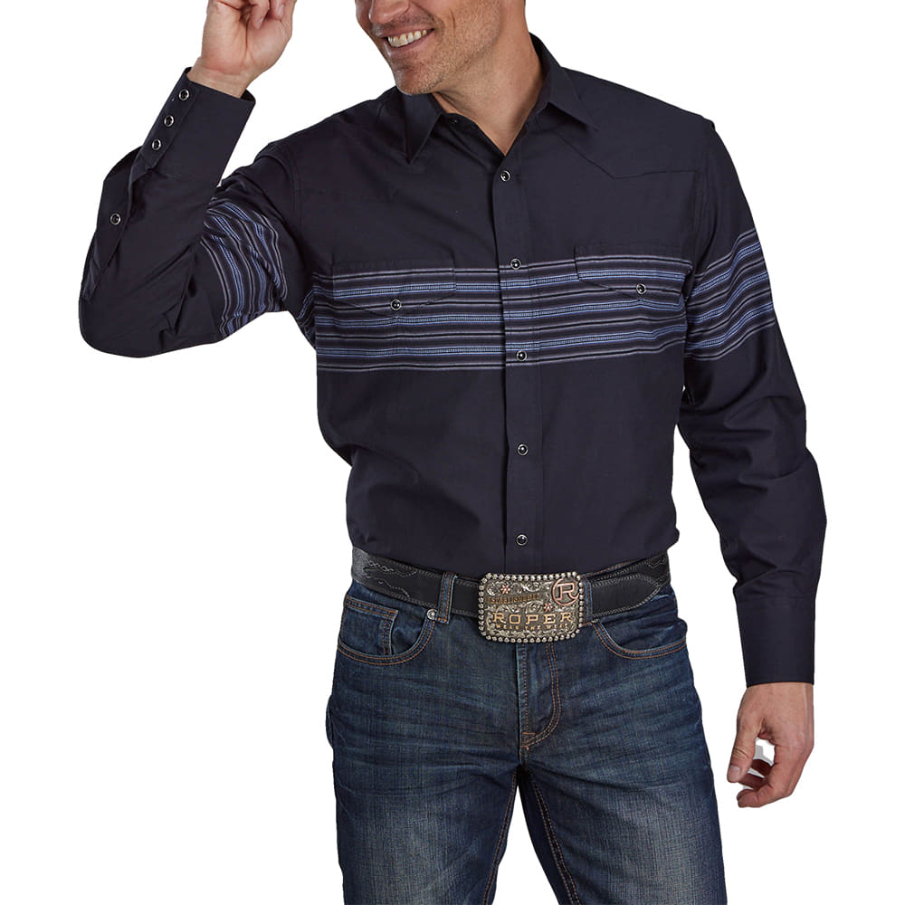 Roper Border Stripe Long Sleeve Snap Men's Shirt In Blue