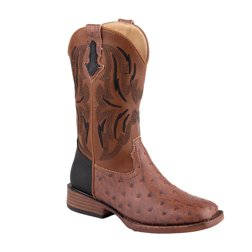 Boy's brown ostrich boots by Roper have a square toe. Get your boy a pair of boots he will love by Roper.