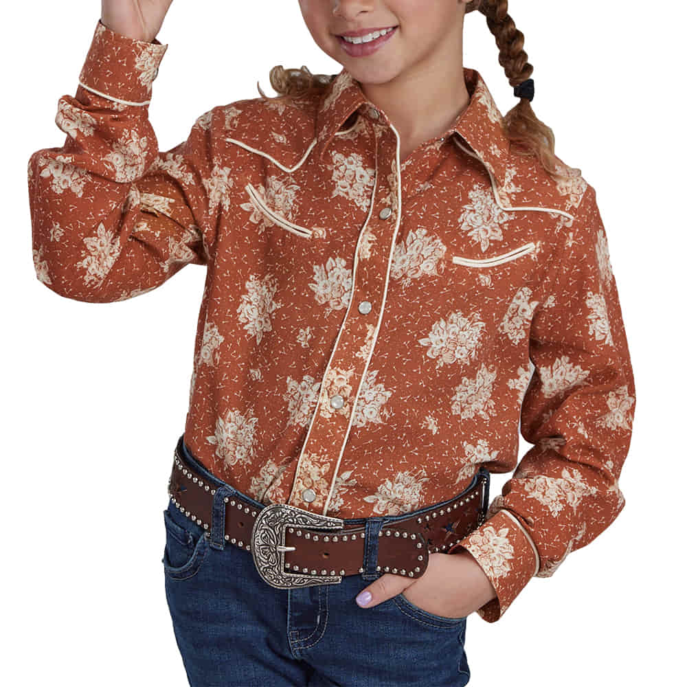 Roper Orange and Cream Floral Print Long Sleeve Girl's Shirt