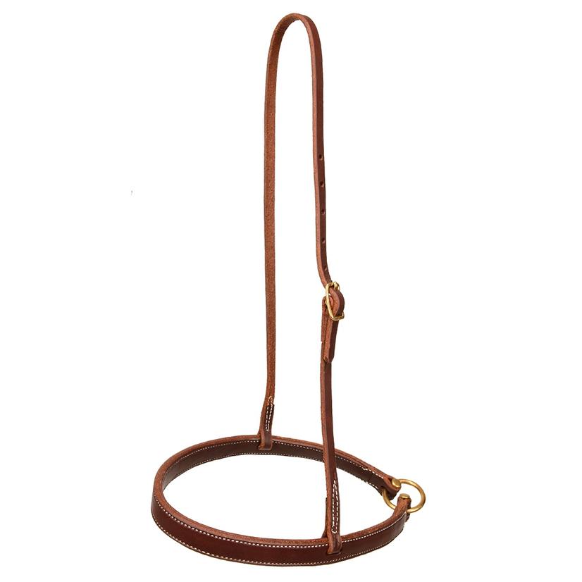 This noseband is made from harness leather and has brass hardware. The leather is doubled and stitched. The hanger is also made from harness leather and has single buckle adjustment.