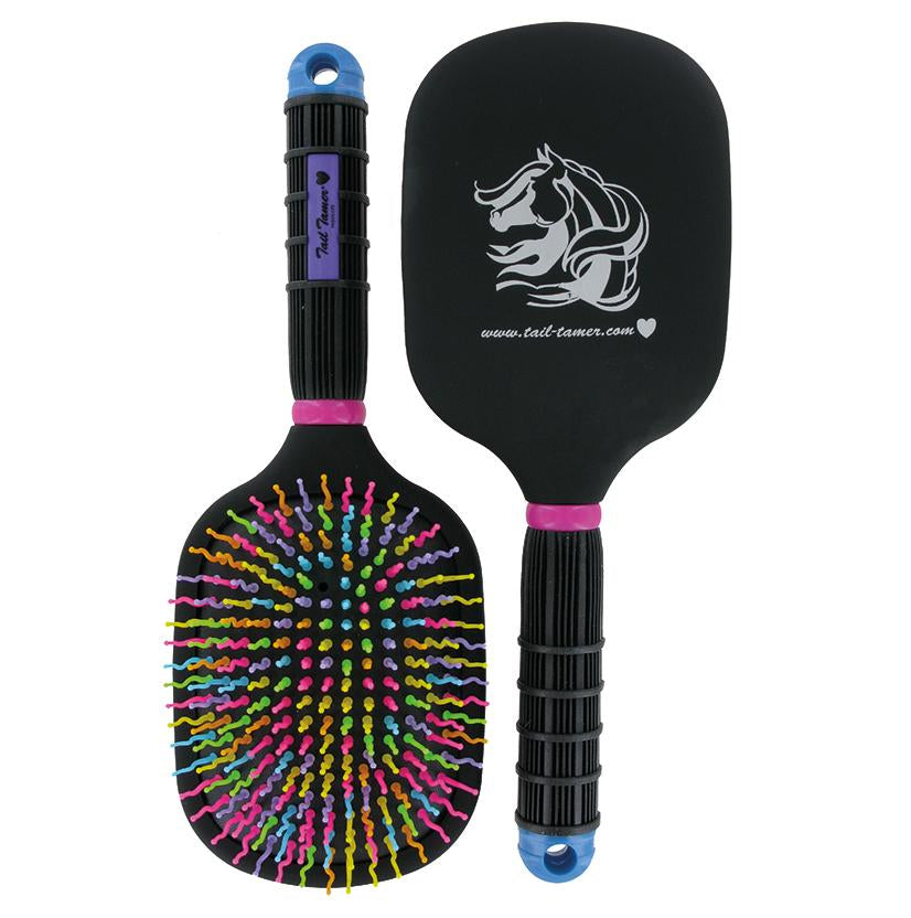The Tail Tamer Goat Brush is sized to fit any hand size. The handles are comfortably slim and feature a rubber grip backing. This brush is made from dense, ultra-soft goat hair bristles.