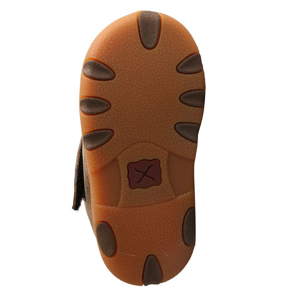 These Twisted X serape mocs are perfect for your little bundle of joy. The brown bomber leather pairs well with the multi-color serape foot. Sits on top of a genuine super slab rubber outsole.
