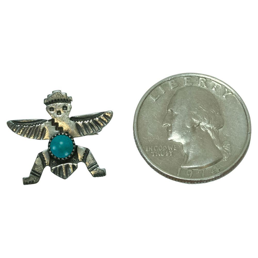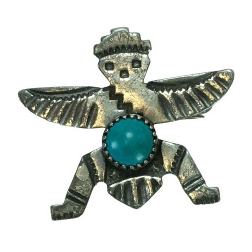Look Authentic with this Vintage Turquoise and Silver Zuni Knifewing pin. Handcrafted and stamped, this unique pin features the Zuni knifewing imbedded with a beatiful round turquoise stone with a twist style trim. Due to authenticity colors and and design may vary.