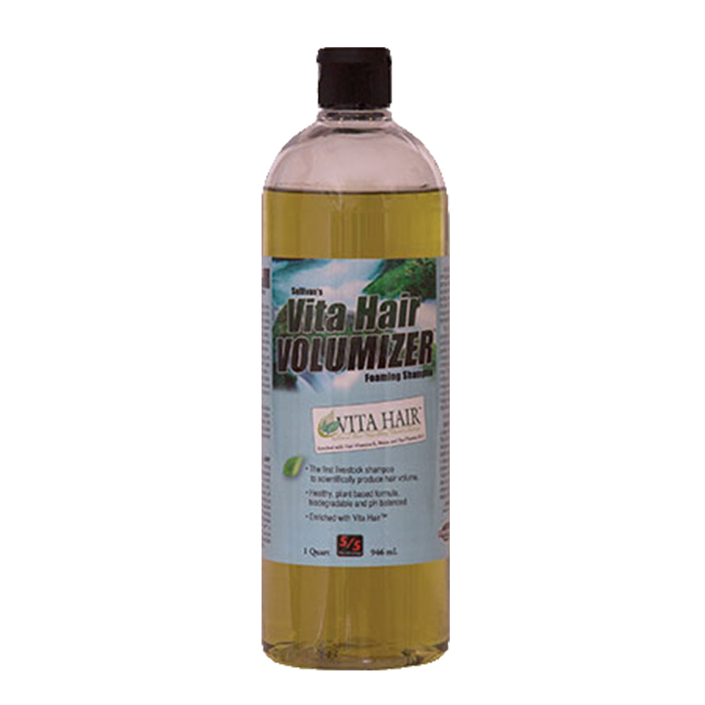 Volume and Body is what South Texas Tack has to offer your Farm Babies!! Vita Hair Volumizer™ Foaming Shampoo is formulated with a natural plant-based proprietary surfactant technology which creates an opposite acting polar electrical charge within each hair strand that actually pushes every hair follicle apart. This prevents the hair from sticking together, and actually springs it loose, making each hair follicle stand on end for a noticeable difference in hair volume and body. This exclusive chemistry for livestock consists of chemically altered ions. All this with a plant based neutral pH makes it gentle and nour-ishing to the hide and hair as it gently cleans deep, down to the roots of each hair follicle. Fortified with Sullivan’s VITA HAIR™ a nourishing vitamin package to boost hair and skin health without added weight to hair. Designed to be used in a foamer. Buy Yours today at South Texas Tack!! Weight: 2.20lbs;