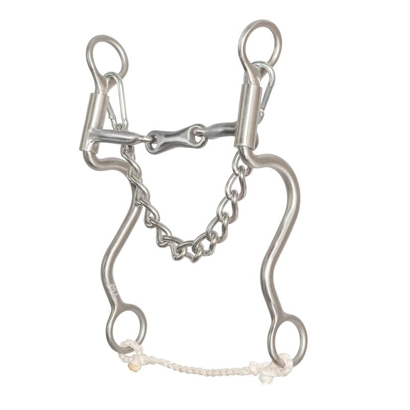 This is a level two Walt Woodard bit by Metalab. The mouthpiece is a 3 piece dog bone made of sweet iron with copper inlays and measures 5 1/8". The cheeks measure 8" and come with a rope slobber bar as well as a stainless steel curb chain.